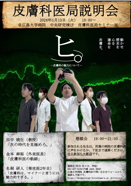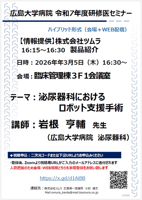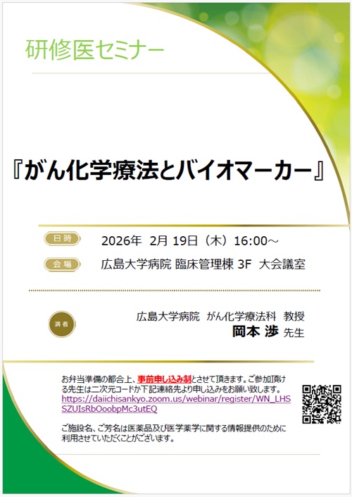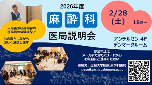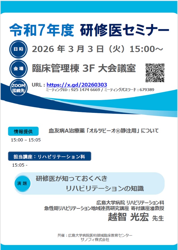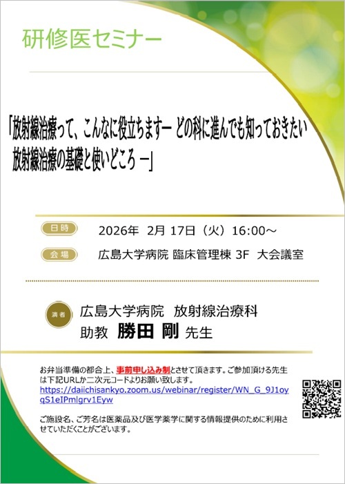 2026年1月 2026.01.28 セミナー情報 (終了しました)泌尿器科におけるロボット支援手術 2026.01.28 セミナー情報 (終了しました)研修医が知っておくべきリハビリテーションの知識 2026.01.09 医局説明会 (終了しました)2026年度 麻酔科 2026.01.07 セミナー情報 (終了しました)がん化学療法とバイオマーカー 2026.01.07 セミナー情報 (終了しました)放射線治療って、こんなに役立ちます ― どの科に進んでも知っておきたい放射線治療の基礎と使いどころ ― 2026.01.05 医局説明会 (終了しました)2026年度 皮膚科